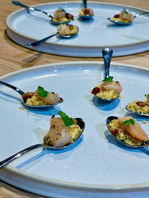 Farofa de maíz, coco, banana, panceta, perejil y langostino sous-vide.